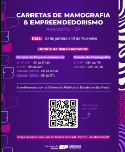O Governo do Estado de São Paulo, por meio da Secretaria de Políticas para a Mulher, chega a Andradina com as carretas de mamografia e empreendedorismo do programa SP Por Todas. Entre os dias 20 de janeiro e 01 de fevereiro, as mulheres do município terão acesso a exames de mamografia para diagnóstico precoce do câncer de mama, além de cursos gratuitos de capacitação profissional, oferecidos pelo Sebrae e pelo Senac, para promover a autonomia financeira. Além de orientações feitas pela Defensoria Pública.
