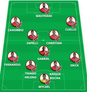 Uma provável escalação tem: Arias; Di Cesare, Sosa e Quirós; Martirena, Almendra, Nardoni e Facundo Mura; Roger Martínez, Baltasar Gallego (Carbonero) e Adrián Martínez.