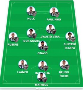 - Quem está fora: Everson (suspenso); Guilherme Arana, Bernard, Cadu, Zaracho e Alisson (lesionados); Alan Franco, Eduardo Vargas e Junior Alonso (com as respectivas seleções para jogos das Eliminatórias)