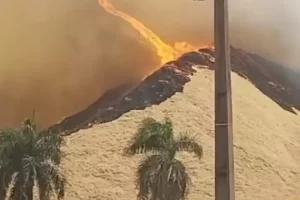 Nas imagens que circulam nas redes sociais, é possível ver que o fogo está bem alto, chegando a formar um redemoinho e liberando muita fumaça.