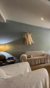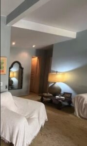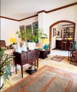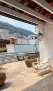 São 700 metros quadrados, três quartos, sendo uma suíte, duas salas, quatro banheiros, uma biblioteca, cozinha e varanda no primeiro piso. O terraço conta com piscina, churrasqueira, sauna, despensa, banheiro, jardim e um espaço gourmet.