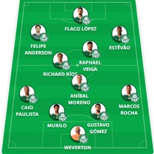 Pendurados: Murilo, Mayke, Richard Ríos, Fabinho, Estêvão, Vitor Reis, Weverton e Mauricio.