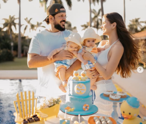 A festa foi realizada na área externa da mansão luxuosa que a família vive no interior de São Paulo. Nas imagens, os pais surgem esbanjando alegria ao lado dos quatro filhos, em meio a decoração encantadora repleta de patinhos. “6 meses dos nossos bebês”, escreveu na legenda.