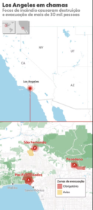 O chefe de polícia de Los Angeles, Robert G. Luna, chamou o incêndio de “sem precedentes e imprevisível”. Segundo o Departamento de Silvicultura e Proteção contra Incêndios da Califórnia (Cal Fire), os incêndios ainda estão sem controle.