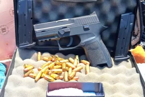Durante revista veicular, foi localizada no interior de uma mala, uma pistola Sig Aswer calibre 380 modelo P250 com a numeração suprimida, 2 carregadores municiados e a arma alimentada e mais 9 munições dentro da caixa da arma, totalizando 39 munições.