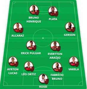 - Quem está fora: Arrascaeta e Léo Pereira (suspensos); Cebolinha (tornozelo esquerdo), Viña (joelho direito), Pedro (joelho esquerdo), Luiz Araújo (joelho direito), De la Cruz (coxa direita), Carlinhos (coxa direita), Alex Sandro (coxa direita) e David Luiz (Tendão de Aquiles).