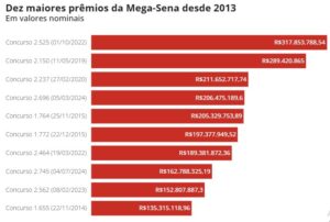 Caso tenha vencedor, o prêmio pago será um dos 10 maiores da história. A lista considera os concursos regulares da Mega — ou seja, não inclui a Mega da Virada.
