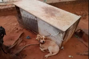 Eles viram que o cachorro, sem raça definida, estava preso a uma geladeira velha em uma coleira muito curta, quase enforcado, e não havia água ou comida para ele. Diante disso, foram constatados os maus-tratos.