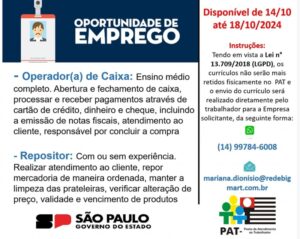 Considerando as orientações do MTE – Ministério do Trabalho e Emprego, razão pela qual os currículos não poderão ser mais encaminhados pelo PAT e também não serão mais retidos fisicamente e o envio do currículo será realizado diretamente pelo trabalhador para a Empresa solicitante, no e-mail ou WhatsApp cadastrados., em resumo: no cartaz de divulgação estará informado o whats e o e-mail da empresa para envio dos currículos pelo próprio trabalhador (publicado na página da Secretaria de Turismo, Desenvolvimento Econômico e Economia Criativa no Facebook. A outra forma de captação de currículos continuará sendo através dos mutirões, quando a empresa agenda data e local para entrevistas e captação de currículos.