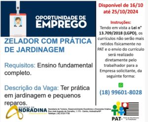 Considerando as orientações do MTE – Ministério do Trabalho e Emprego, razão pela qual os currículos não poderão ser mais encaminhados pelo PAT e também não serão mais retidos fisicamente e o envio do currículo será realizado diretamente pelo trabalhador para a Empresa solicitante, no e-mail ou WhatsApp cadastrados., em resumo: no cartaz de divulgação estará informado o whats e o e-mail da empresa para envio dos currículos pelo próprio trabalhador (publicado na página da Secretaria de Turismo, Desenvolvimento Econômico e Economia Criativa no Facebook. A outra forma de captação de currículos continuará sendo através dos mutirões, quando a empresa agenda data e local para entrevistas e captação de currículos.