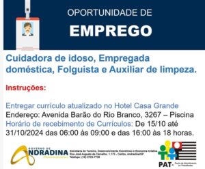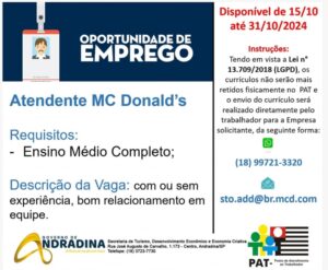 O Posto de Atendimento ao Trabalhador de Andradina tem 40 novas oportunidades de trabalho na cidade. A maior oferta de vagas é para atendente na rede de fast food McDonald’s.