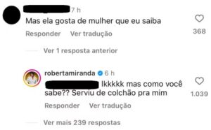 Com a repercussão do vídeo, Roberta respondeu alguns comentários nas redes sociais. “Mas ela gosta de mulher que eu saiba”, escreveu uma internauta. “(risos). Mas como você sabe?. Serviu de colchão pra mim?”, rebateu a cantora, com bom humor.