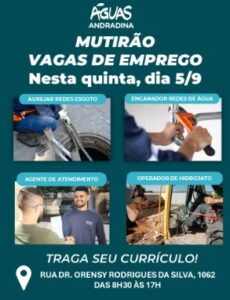 Está procurando emprego? Participe do mutirão de currículos da Águas Andradina nesta quinta-feira (05/09), das 8h30 às 17h. Vagas em diversas áreas! Leve currículo e documento com foto. Saiba mais em: